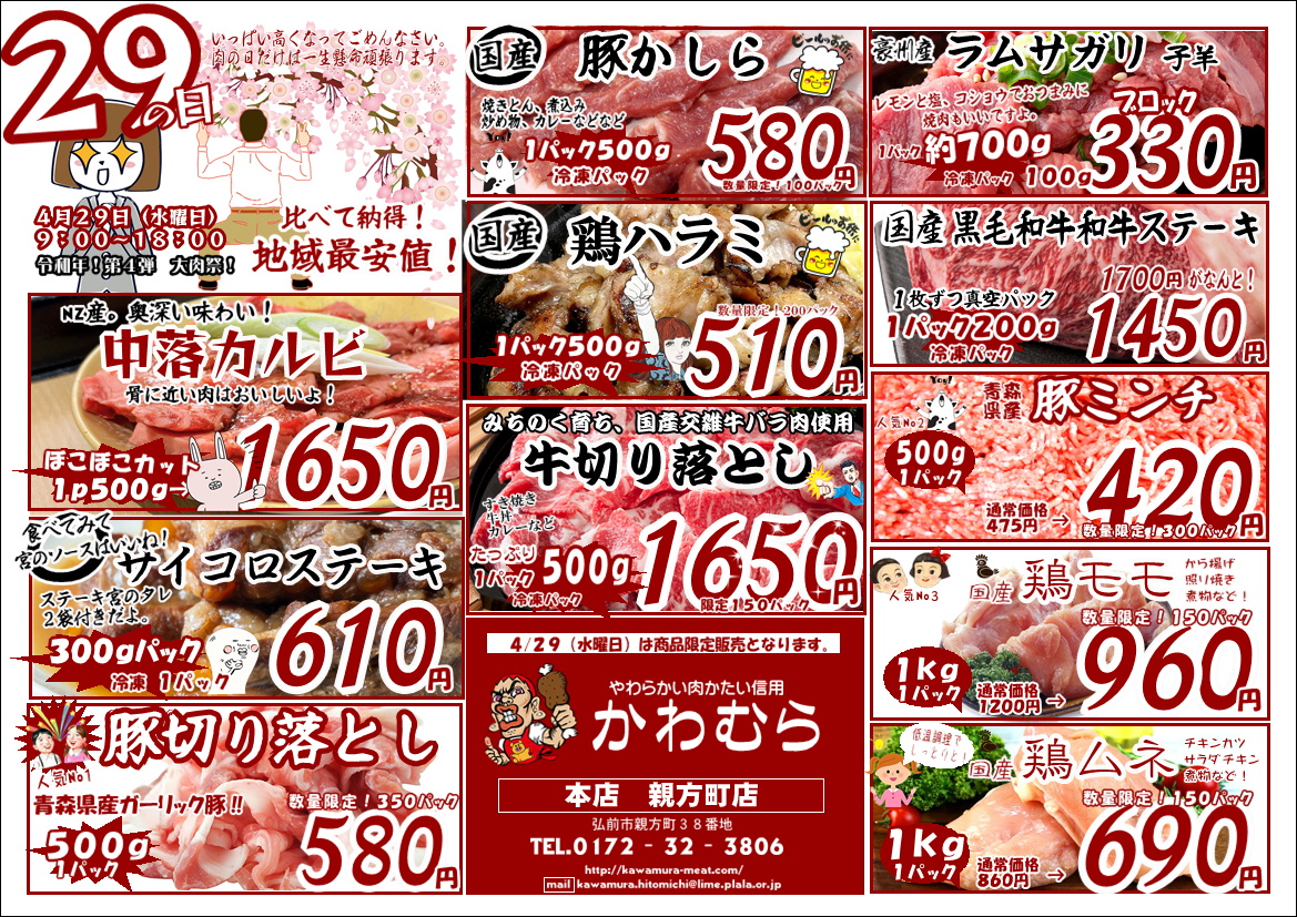 特集の一覧 SPECIAL 毎月29日恒例!『最強激安価格』!今月の目玉商品は?… ( ゚Д゚) 2018.11.25 おまたせしました。 全店共通、今月の29日(肉の日) 各店、ご予約お待ちしております。